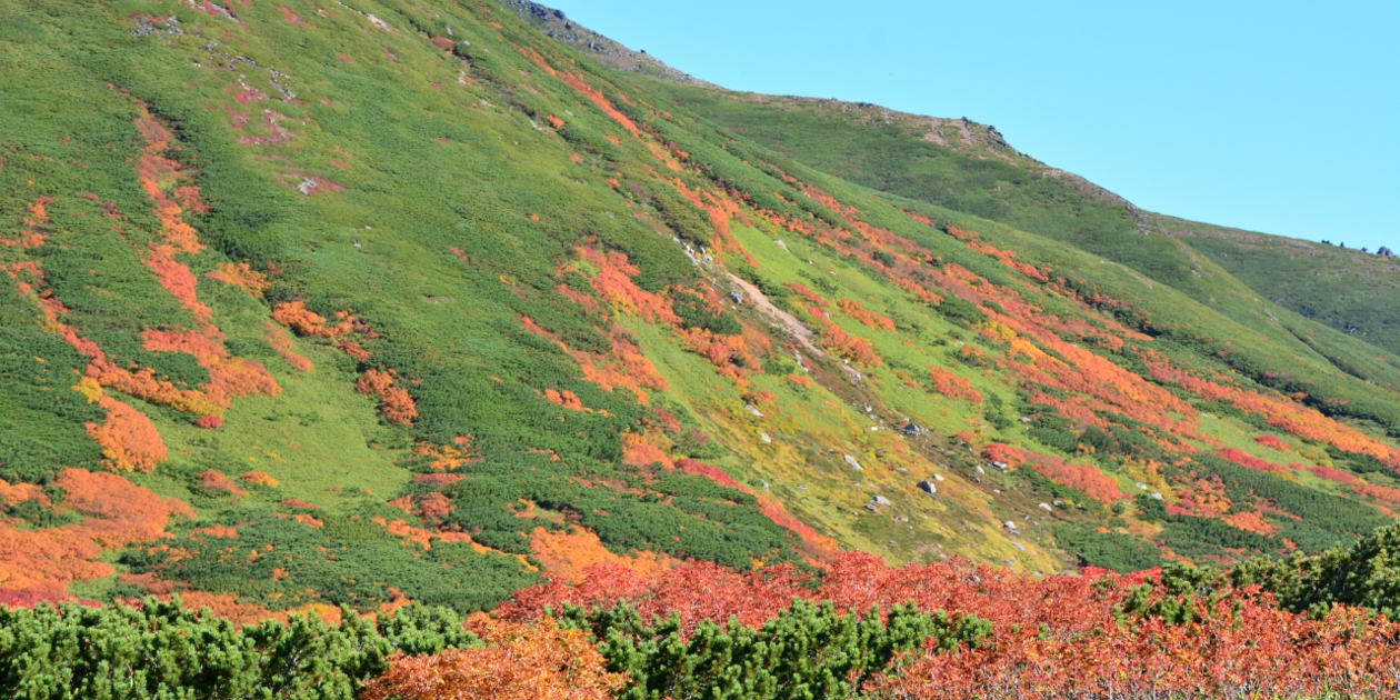 ■ 右に行ったり、左に行ったりあれこれ撮影場所を物色します。チングルマは赤い葉っぱだけになった株が多く、綿毛がしっかり着いている株は割とまれです。空は、真っ青で山の緑、そして紅葉した色づきが見られ、とってもよい気分になれます。また、この時間だと早いのですれ違う人はほとんどなく、中岳方向から降りてきた方一人だけでした。音もほとんどどなく、じりじりと日差しがあるだけで、風も少し弱くなり静かな物です。気温は10度ちょっと位で、歩くのをやめると寒くなってきます。満足していよいよ当麻乗越に向かいます。