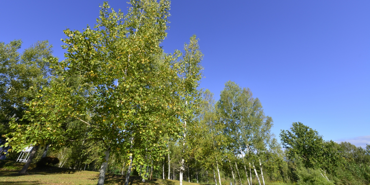 ■ 三愛の丘の西側のしらかばの合間から太陽がきらきらしていて、いい雰囲気です。最近このトイレの裏側まで来る方が多くなったと思っていたら、西側の夕陽はなかなかであるとパンフにも書いてあるのを見ました。だからみなさん見ていかれるんですね。反対側の南側は、残念ながら山々は雲隠れしていて見えなくなっています。