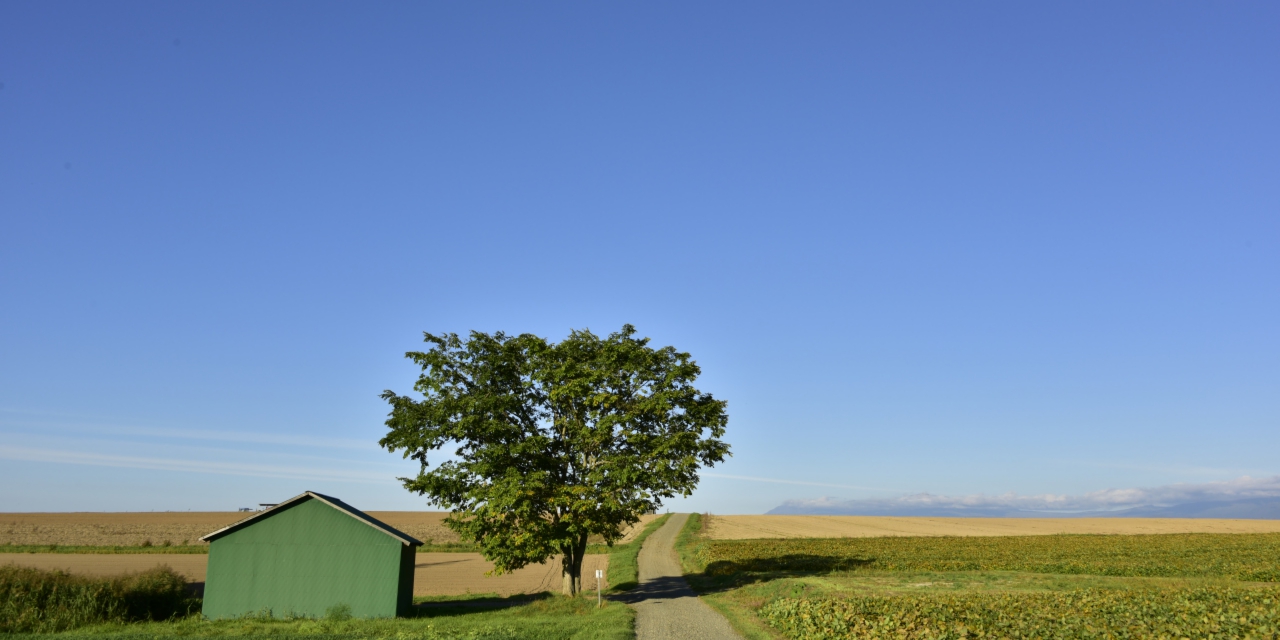 ■ 新栄の丘に上がりからまつと緑の小屋を夕方の日差しで撮っておきます。新栄の丘はまめが入っているところとじゃがいもの場所があり、じゃがいもを載せたトラクターが迫ってきます。畑側によけていただきなんとか通ります。国道沿いのローソンに出てから北西の丘へ移動して、本日の成果報告をします。16時30分頃でしたが、佐藤商店はシャッターがおりていました。