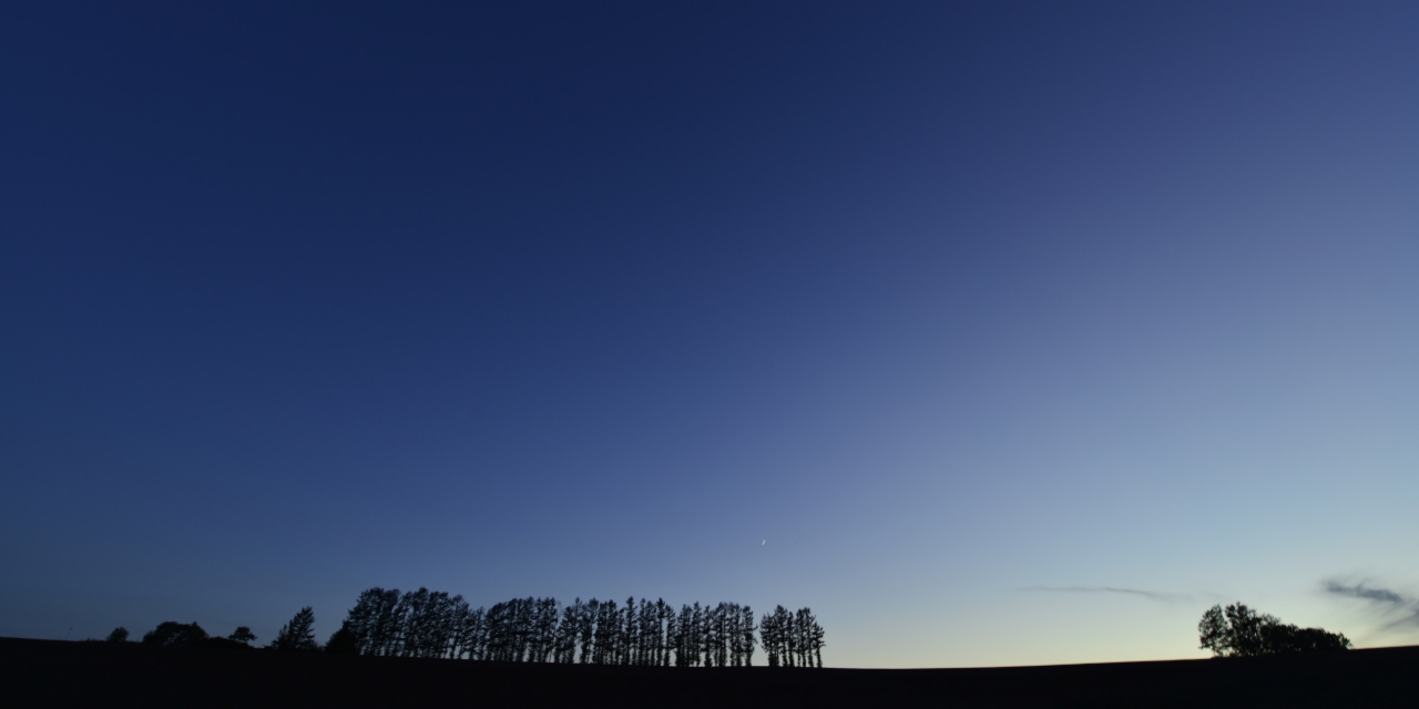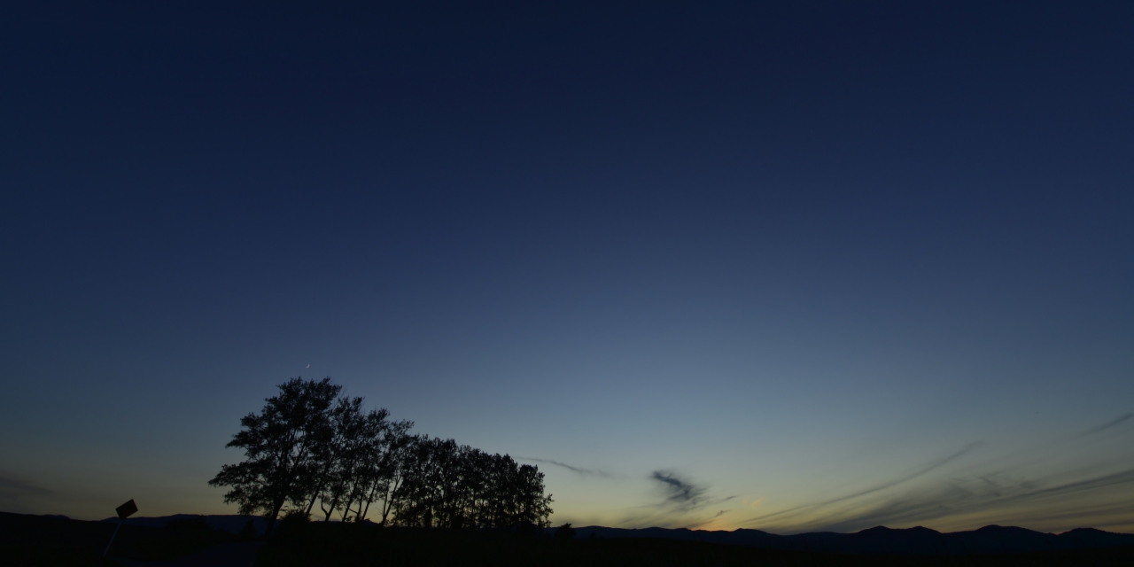 ■ 今日の夕陽は、マイルドセブンの丘にあるからまつの塊近くで夕焼けを待ちます。残念ながら目だった色づきはありませんでした。近くの木々も暗くなった空といっしょに撮ってから戻りました。