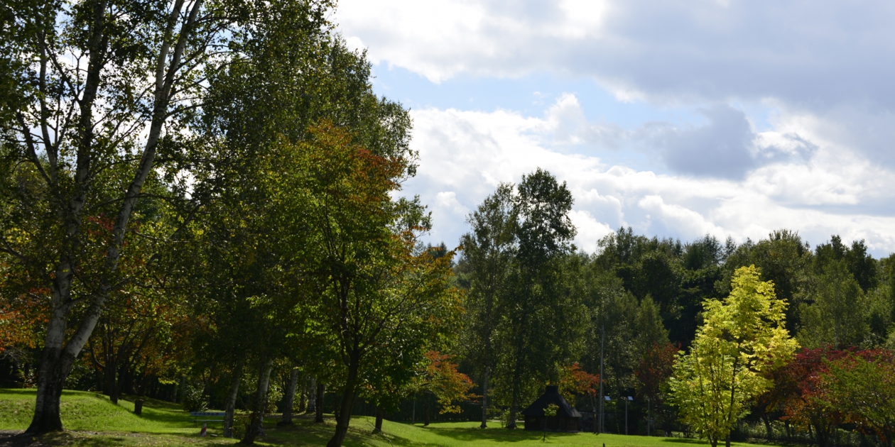 ■続いて秋色を見つけに東神楽の森林公園に行ってみました。もときた道を戻りますがいつもの場所でパトカーが見張っていました。ゆっくり走りましょうね。東川から橋を通って少し登ると森林公園があります。少しばかりの方がおられる程度で静かでした。木々は、黄色くなったり、桜の葉っぱが赤くなったりと少しだけ色づきが進んでいました。茂った木々と空を入れて広い空間を見てきました。