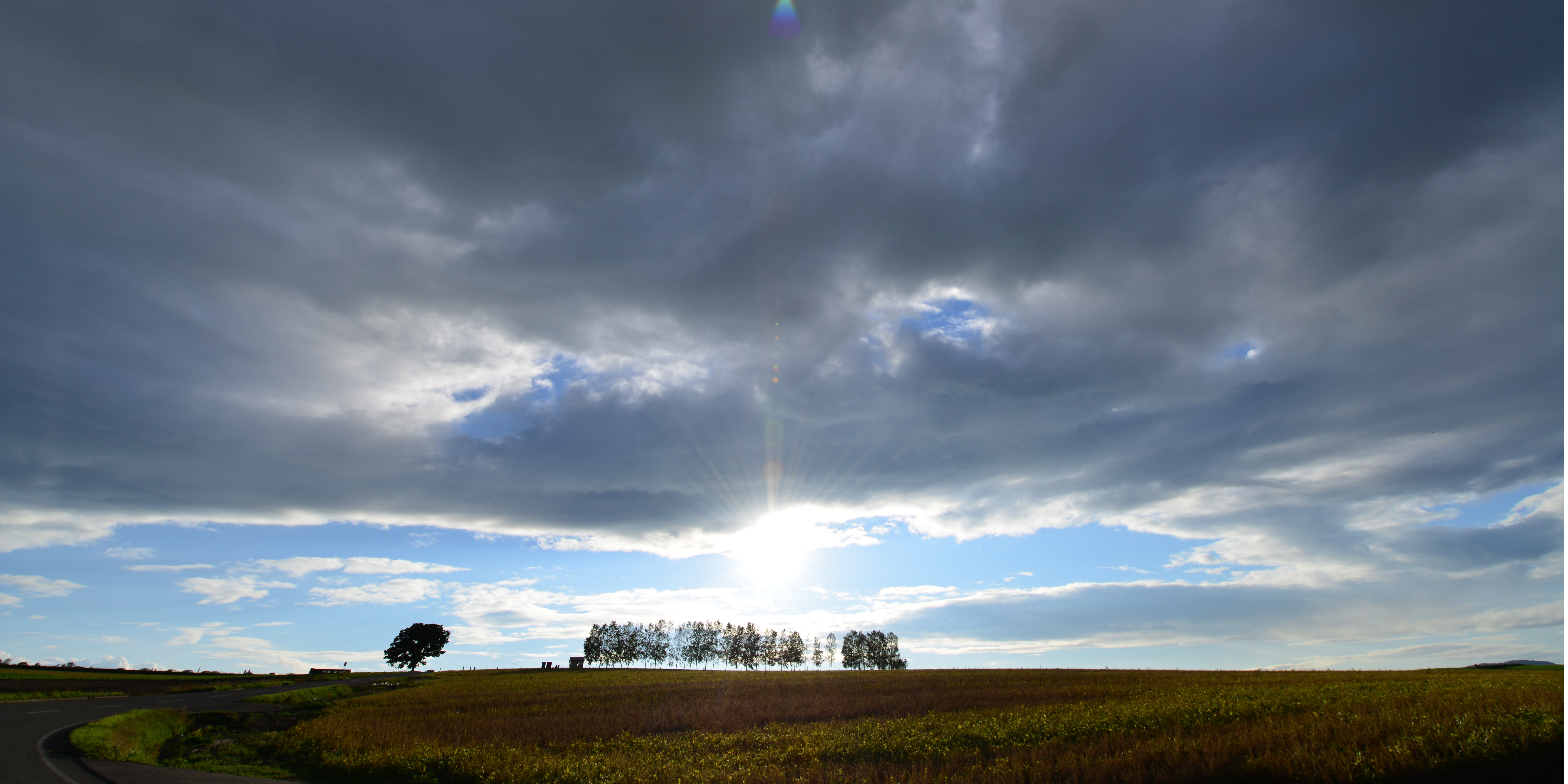 ■ローソンで食料を仕入れて北西の丘の観光案内所に立ち寄ります。自転車がたくさん走っています。イベントのようでたくさんの係の方が誘導しています。北西の丘もさくらの葉っぱが色づいていたり、からしなが咲いていたりと秋モードになっています。夏ほどではありませんが、駐車場は結構車が停まっていて賑やかです。案内所ではジャジー牛のソフトクリームが売れていました。巡回している監視員の方の情報で北瑛小学校近くにからしなありと情報でしたので、行ってみました。セブンスターの木としらかばを東側から眺めて、太陽が木の間に入った様子を撮っておきました。親子の木、姑の木に寄ってからからしなの場所を遠くから確認します。ぐるっと回ってからしなの植わっている畑の前にたどり着きます。丁度日差しが強く当たっていて、バックの空は黒い雲で、黄色との対比がなかなかいい感じです。遠くには小さい虹がでていましたし、西日に照らされたからしなもきらきらしていました。からしなに満足したのでもう一度セブンスターの木を見てからマイルドセブンの前を通って国道に出ます。